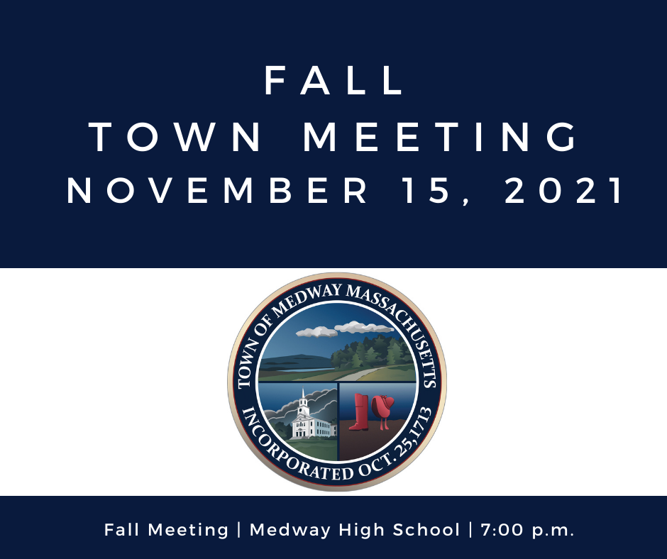 Fall Town Meeting is Monday, November 15 at 7:00 p.m. The meeting will be held at 7:00 p.m. at Medway High School, 88 Summer Street. Masks will be required. Warrant articles for vote include prior year bills, transfer to Fire Department budget, free cash transfer to the facility stabilization fund, capital items (portable voting machines, portable baseball field fence & storage and security cameras), free cash transfer to the athletic field stabilization fund,, free cash transfer for consultant for BESS study, transfer CPA funds for a 1964 fire truck restoration, transfer CPA funds to construct the accessible trail, viewing platform and associated parking, amend zoning by-law: environmental standards, amend zoning bylaw BESS moratorium, amend zoning by-law schedule or uses, energy resource district, housing keeping, construction equipment and street acceptance: Bramble, Briar, Fern, Field, Redgate. Town warrant.