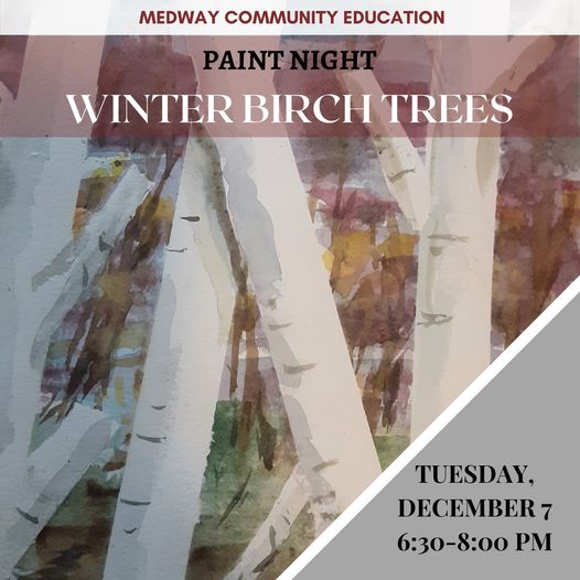 Learn to paint lovely winter birch trees with Medway Community Education. Use your final product as home décor or for a holiday gift. No experience necessary, just a willingness to follow simple directions to create this stunning masterpiece.