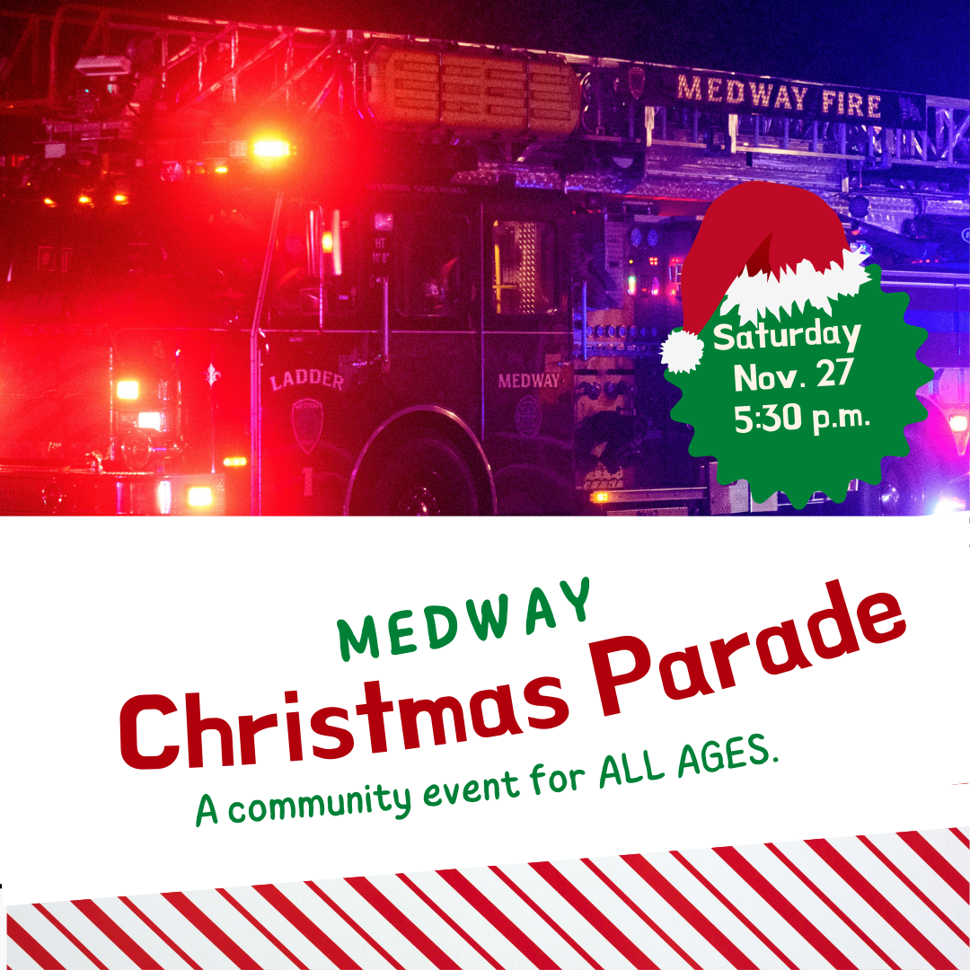 Save the date for Medway's Annual Christmas Parade and fireworks over Choate Park! Last year's route was such a success that we decided to keep it! The parade will begin at 5:30 p.m. on November 27. It will leave MHS and take a left onto Summer St, left onto Milford St, will follow to Franklin St, left onto Village St, left onto Holliston St, and finally a left onto Main St. Fire trucks will lead Santa's float. The parade will end at Choate Park/Thayer Homestead. A concession stand, music, and a visit from Santa along with a short ceremony will be held. The evening will culminate with festive tree lighting and fireworks! Congratulations to this year's grand marshall(s); Maryjane White, Charlene Tingley, Steve Mitchell, Dave D'Amico, John Rojee and Joe MacDougall.