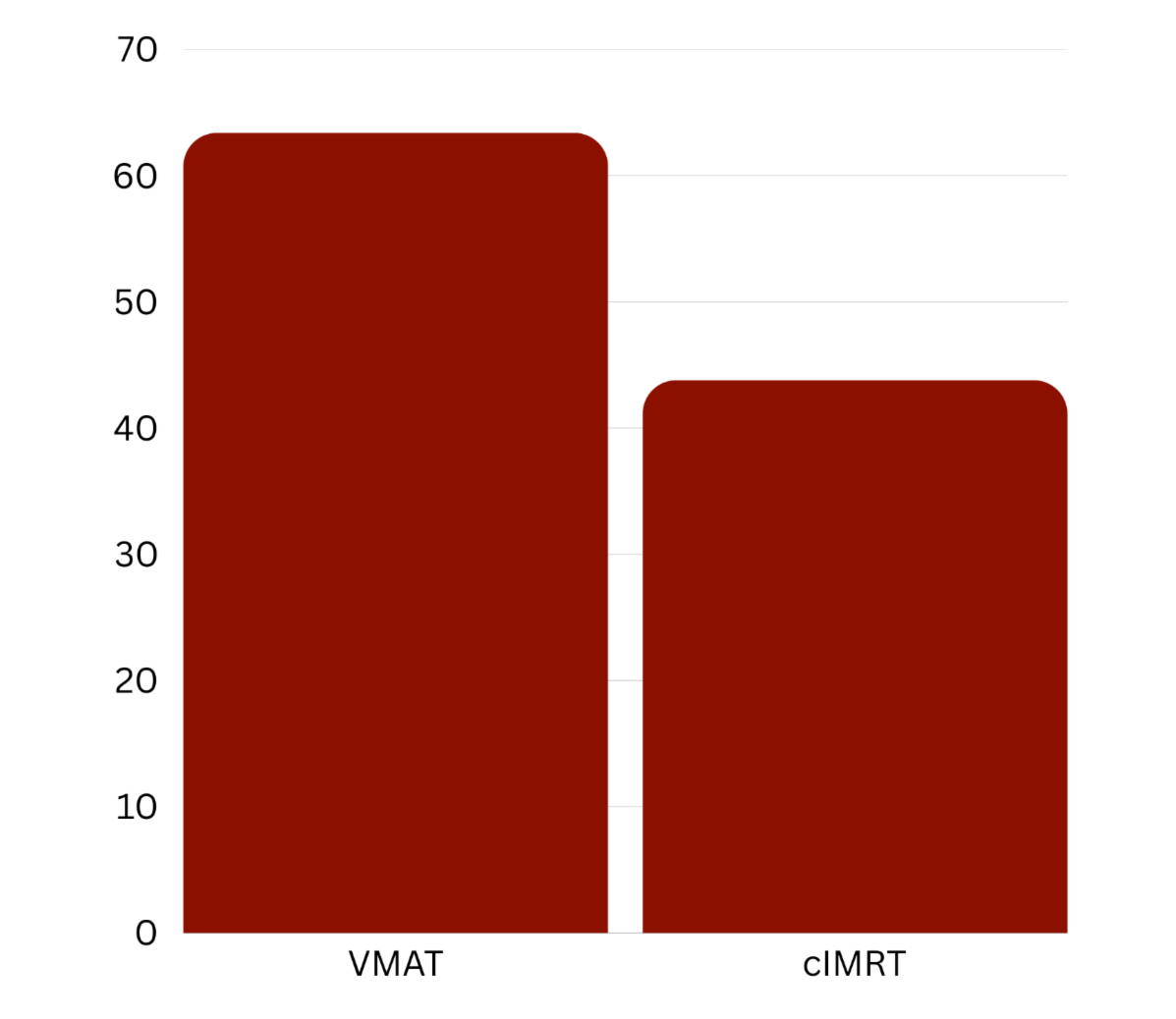 The study found that patients treated with VMAT had a higher five-year survival rate (63.4%) compared to those treated with cIMRT (43.8%). VMAT also showed slightly better control of the cancer in the area, but the difference was not significant.