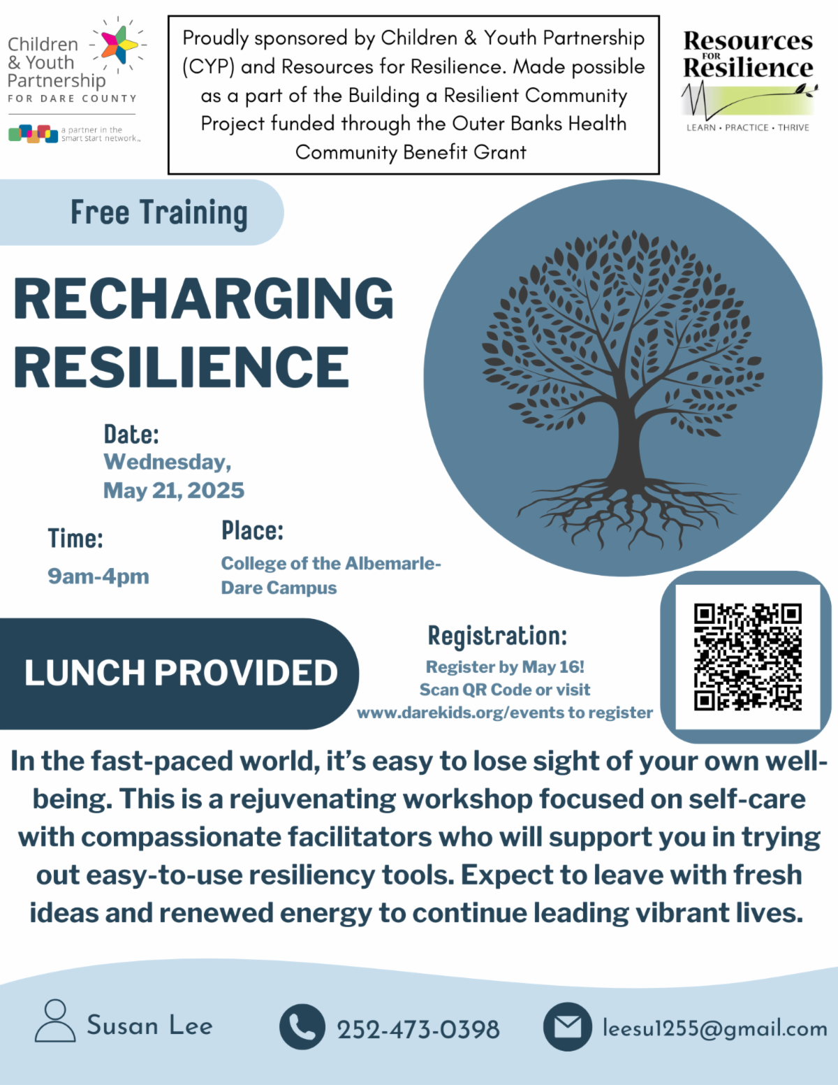 Children & Youth Partnership for Dare County is partnering with Resources for Resilience to offer a FREE Recharging Resilience training on Wednesday, May 21 from 9am-4pm at College of the Albemarle in Manteo.