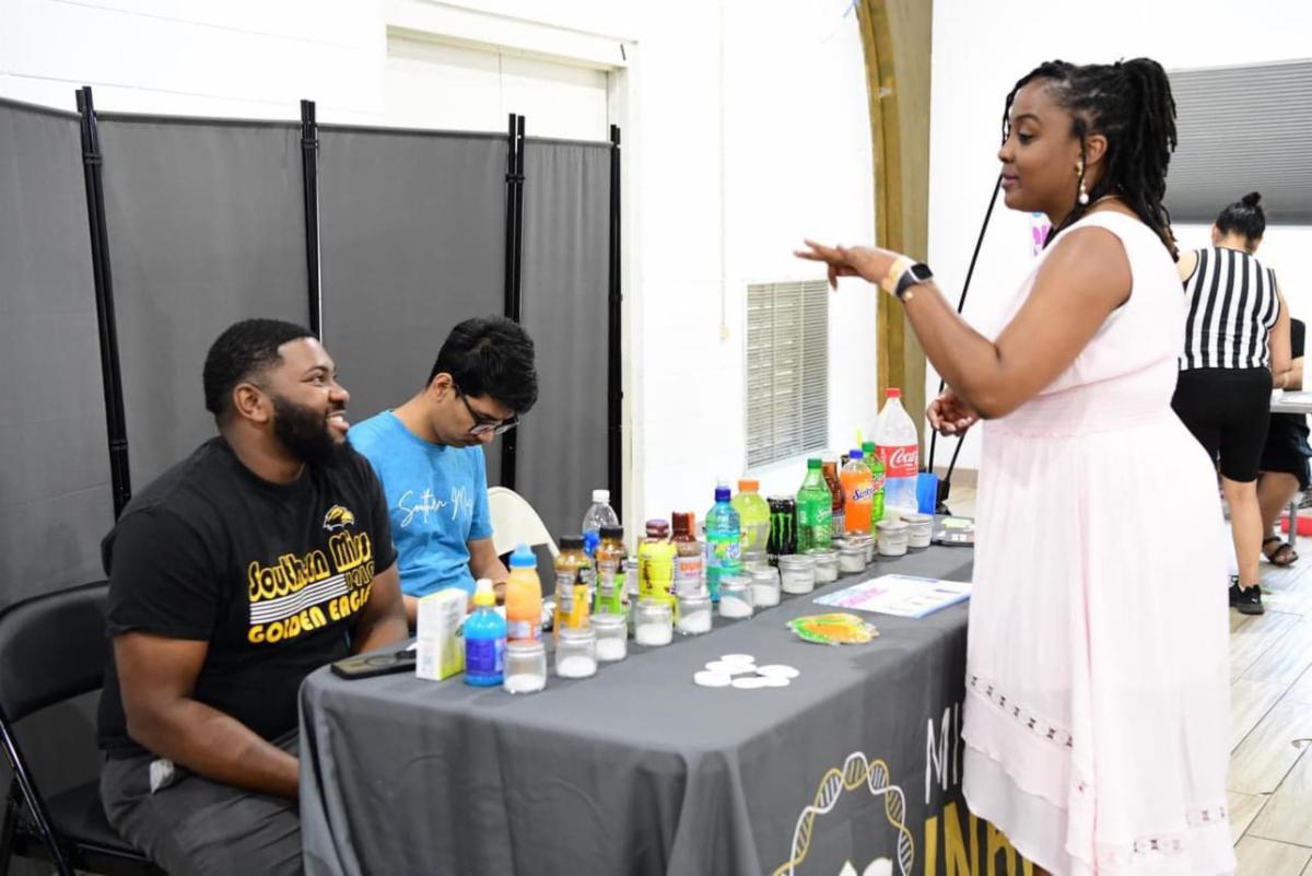 Our outreach efforts aim to raise awareness about health and disease risks while promoting healthier food and beverage choices for individuals of all ages in Mississippi communities. Our focus on the dangers of excessive sugar and salt intake helps communities make more informed decisions about their diets. One of our key initiatives, titled "Sugar Shockers," features a table exhibit displaying bottles of popular sodas, juices, and energy drinks to highlight the high sugar content in these beverages.