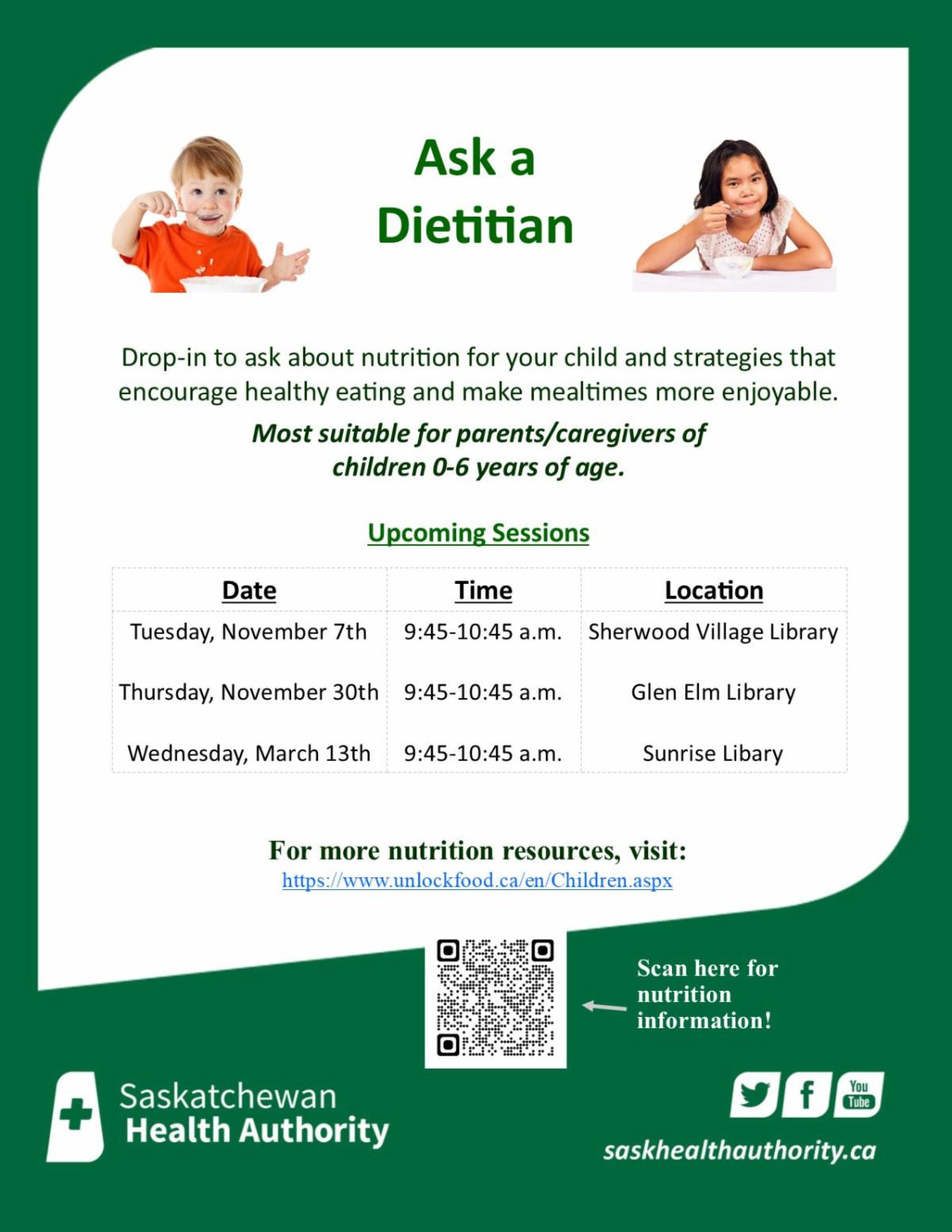 Drop-in to ask a Registered Dietitian about nutrition for your child and strategies that encourage healthy eating and make mealtimes more enjoyable.