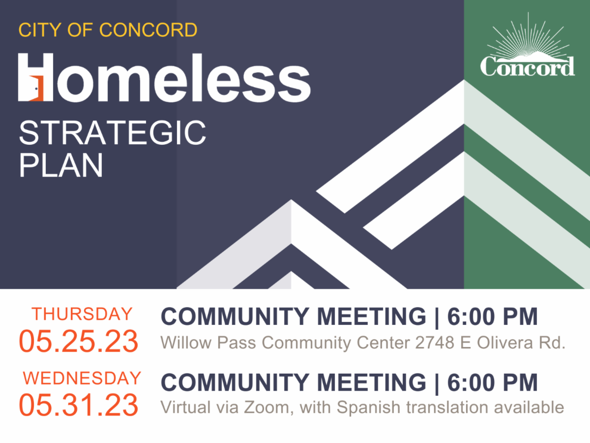The public is invited to participate in the Community Meetings to learn, share ideas, and give input on the issue of homelessness in the City of Concord. The data collected from these events will help identify community goals and priorities that will inform the Homeless Strategic Plan Working Group in development of an actionable strategic plan to respond to homelessness in Concord. Information gathered at the meetings will be shared with the Homeless Strategic Plan Working Group and project team.