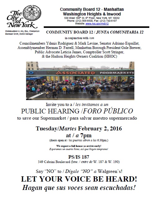 This coming Tuesday, we will be holding a public hearing on the efforts to save Associated Supermarket on Fort Washington and 187th Street from closing. This issue is severely important as it is the one affordable supermarket in the area, having served the Fort Washington community for 30 years.
