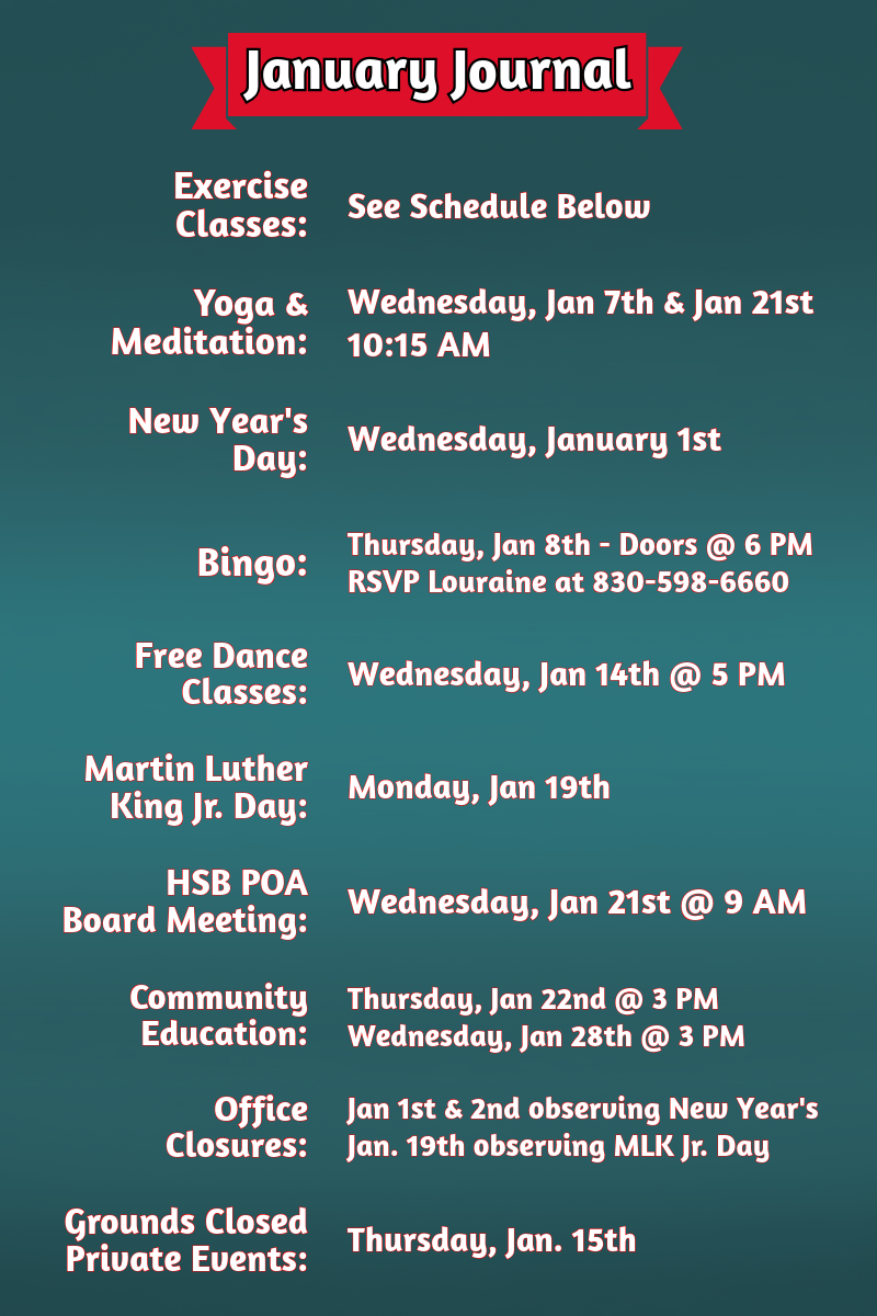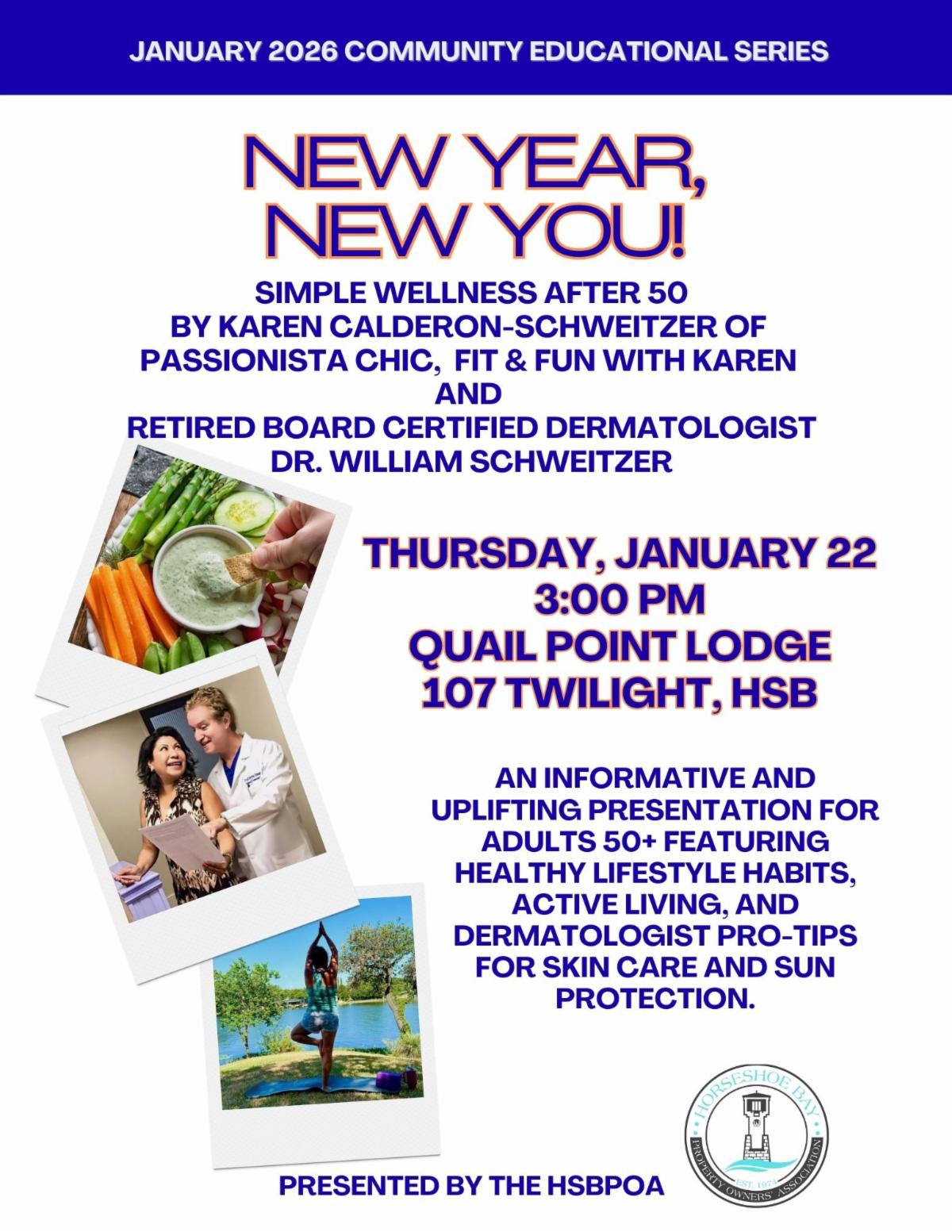 | | Throughout the interview, Jim repeatedly expressed his appreciation for the Horseshoe Bay POA Staff, Board, and everyone involved in helping make the group’s meetings possible. He credits the POA and the broader community for creating an environment where open discussion and civic engagement can thrive. In true Jim fashion, he deflected personal praise and redirected it toward the group and the community that supports it. His quiet leadership and commitment to inclusion reflect the best of Horseshoe Bay, reminding us that strong communities are built not just on shared views but on shared respect and the willingness to listen. | | The Hill Country Choir and Gun Club meet weekly in the Lodge Room of Quail Point Lodge. Their schedule is the first and second Wednesday mornings of the month at 9:00 AM, with the remaining meetings held on Thursdays. | Please note - The HSB POA does not support or endorse any political candidates or parties. We offer space at Quail Point Lodge for our member's usage. | | We are starting 2026 with two amazing Community Education events, and we are very excited. First, POA members Karen Calderon-Schweitzer and her husband, retired dermatologist Dr. William Schweitzer, will lead a wellness seminar. They will give an upbeat and helpful talk about simple wellness after age 50. Topics will include healthy habits, staying active, and practical skincare tips. | | The following week, we will have another education event on Fall Prevention, led by Horseshoe Bay resident Steve Muller, a retired doctor who practiced Otolaryngology for over 30 years. This session will cover why falls happen, their effects, and how to prevent them—an important topic for many adults as we get older. Having two experienced doctors share free, practical health advice at the start of the year is an excellent opportunity for our community. | | We work with the Horseshoe Bay Architectural Control Committee to enhance and maintain the Horseshoe Bay community. This message is from the HSB ACC: | | |