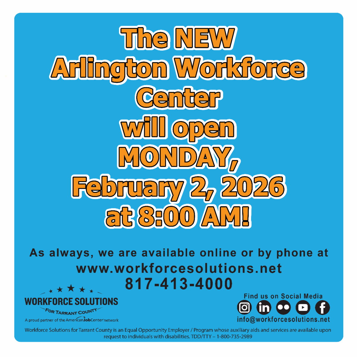 Our Arlington Workforce Center will reopen at the new location (2000 E. Lamar) on Monday, February 2, 2026 at 8am.