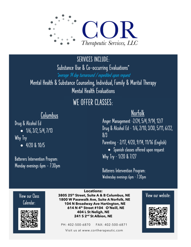 The goal of Hopeful Horizons is to be the organization that people call first. People are able to share what they are experiencing, and we can help direct that person(s) to agencies or organizations that would appear a good fit. There’s more! Hopeful Horizons is working to bring more awareness, training and events to our communities to help increase awareness and decrease the stigma of utilizing resources around mental health. We have a board that oversees Hopeful Horizons and we have monthly community meetings. There are ways for everyone to be involved and we need people like you to make a commitment to learning and helping be part of the change. Monthly meetings are on the 4th Monday of each month at 6pm at the Columbus Library, 2nd floor.