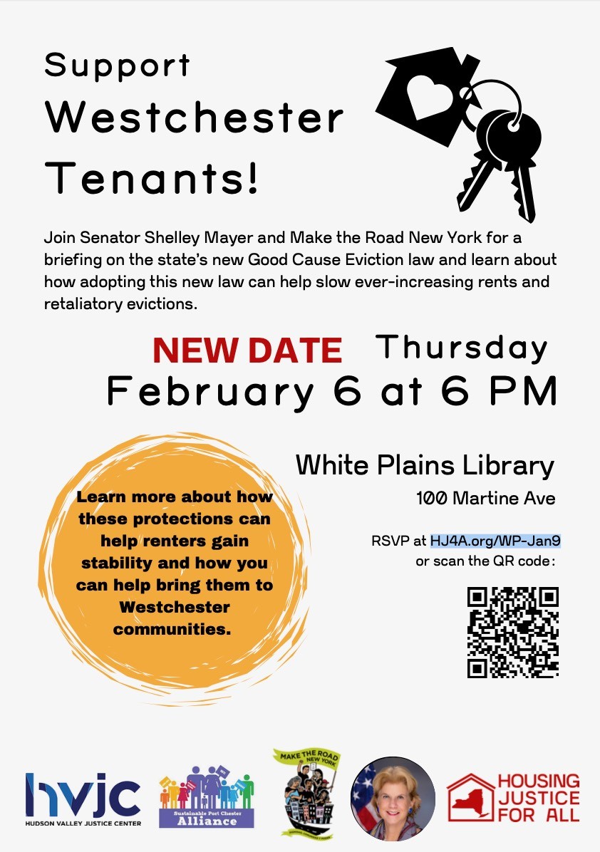 Please join me Thursday, February 6 at 6 p.m. for an information session on the state's Good Cause Eviction Law, alongside Make the Road New York, Sustainable Port Chester Alliance, Mamaroneck Affordable Housing Coalition, and Hudson Valley Justice Center. Attend and learn about how municipalities can adopt these protections to slow ever-increasing rents and retaliatory evictions in a fair and economically sustainable way. RSVP: HJ4A.org/WP-Jan9