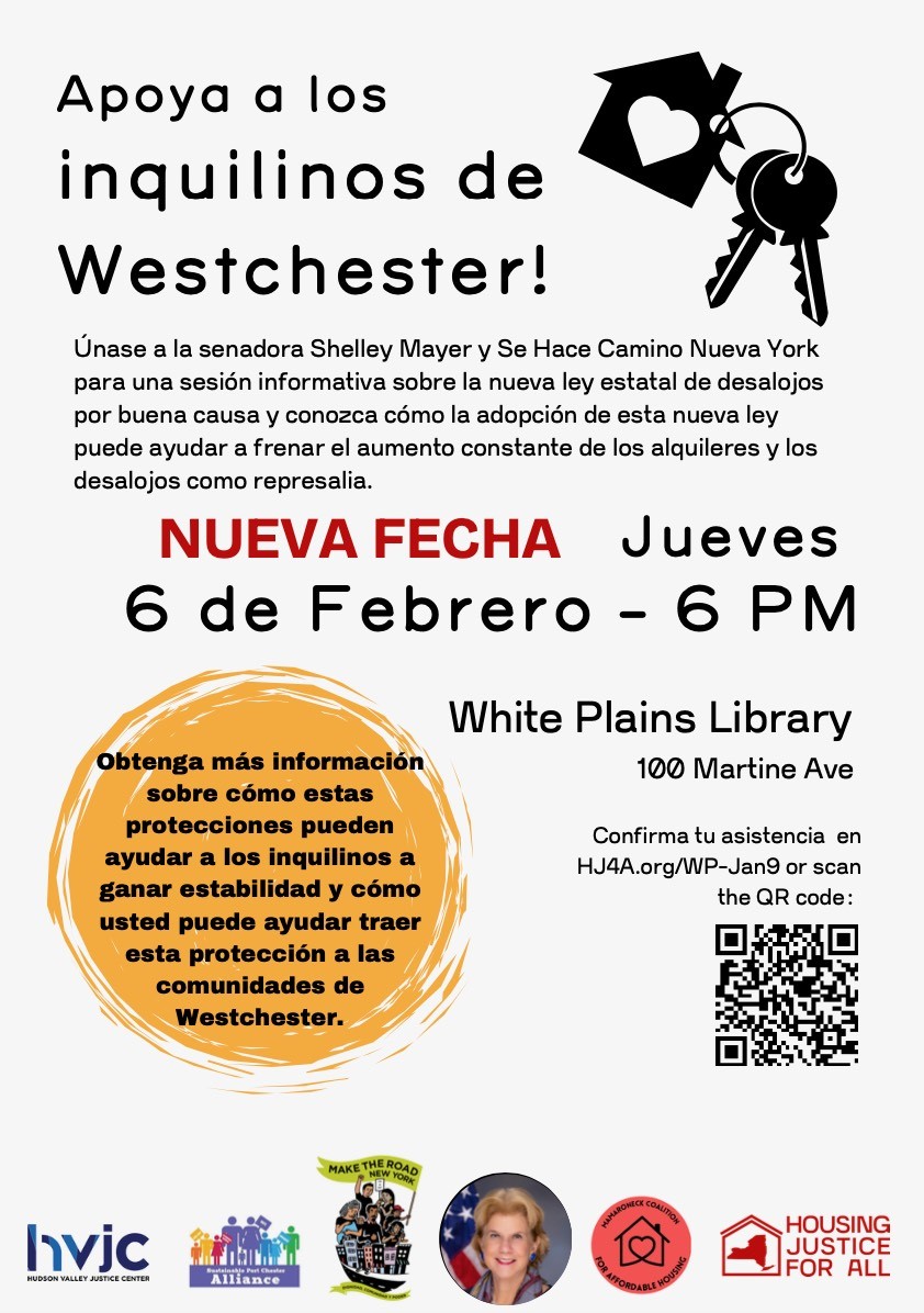 Por favor acompañenme el Jueves 6 de Febrero a las 6 p.m. para una sesión informativa sobre la Ley de Desalojo por Buena Causa del estado, junto con Make the Road New York, Sustainable Port Chester Alliance, Mamaroneck Affordable Housing Coalition y Hudson Valley Justice Center. Atienda y aprenda cómo la adopción de estas protecciones pueden ayudar a atrasar el constante aumento de la renta y los desalojos vengativos. Confirme su asistencia: HJ4A.org/WP-Jan9