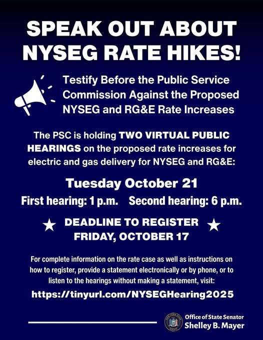 For those who cannot attend or prefer not to comment at the public hearings, comments can also be provided by internet, mail, or telephone. All comments should refer “Case 25-E-0375 – NYSEG Electric,” “Case 25-G-0378 – NYSEG Gas,” “Case 25-E-0379 - RG&E Electric,” or “Case 25-G-0380 - RG&E Gas.” You have until October 24 to submit testimony virtually, by mail, or by phone.