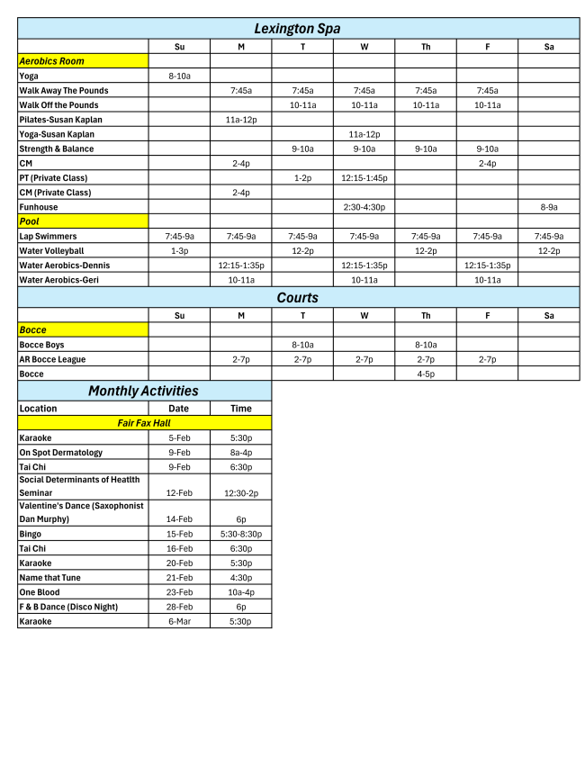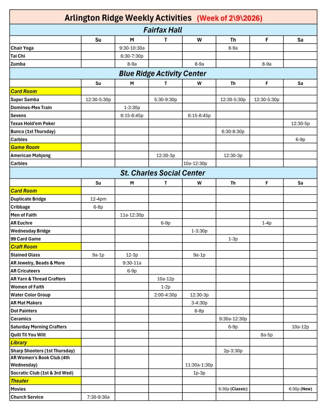 Due to recent scheduling issue and challenges, we are asking all groups\clubs to verify their class days, and activity start and end times with Robbin. This will help us accurately assist new groups with scheduling and ensure we can continue offering new activities for residents.