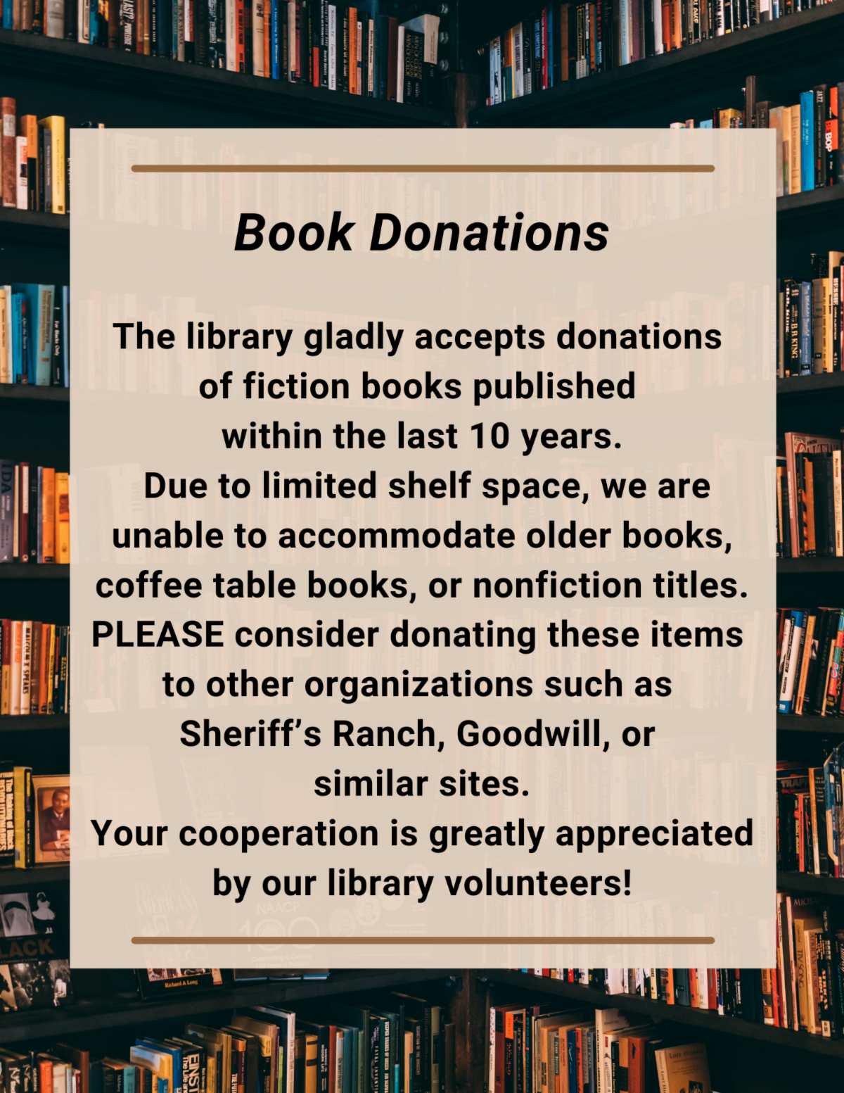 The library gladly accepts donations of fiction books published within the last 10 years. Due to limited shelf space, we are unable to accommodate older books, coffee table books, or nonfiction titles.