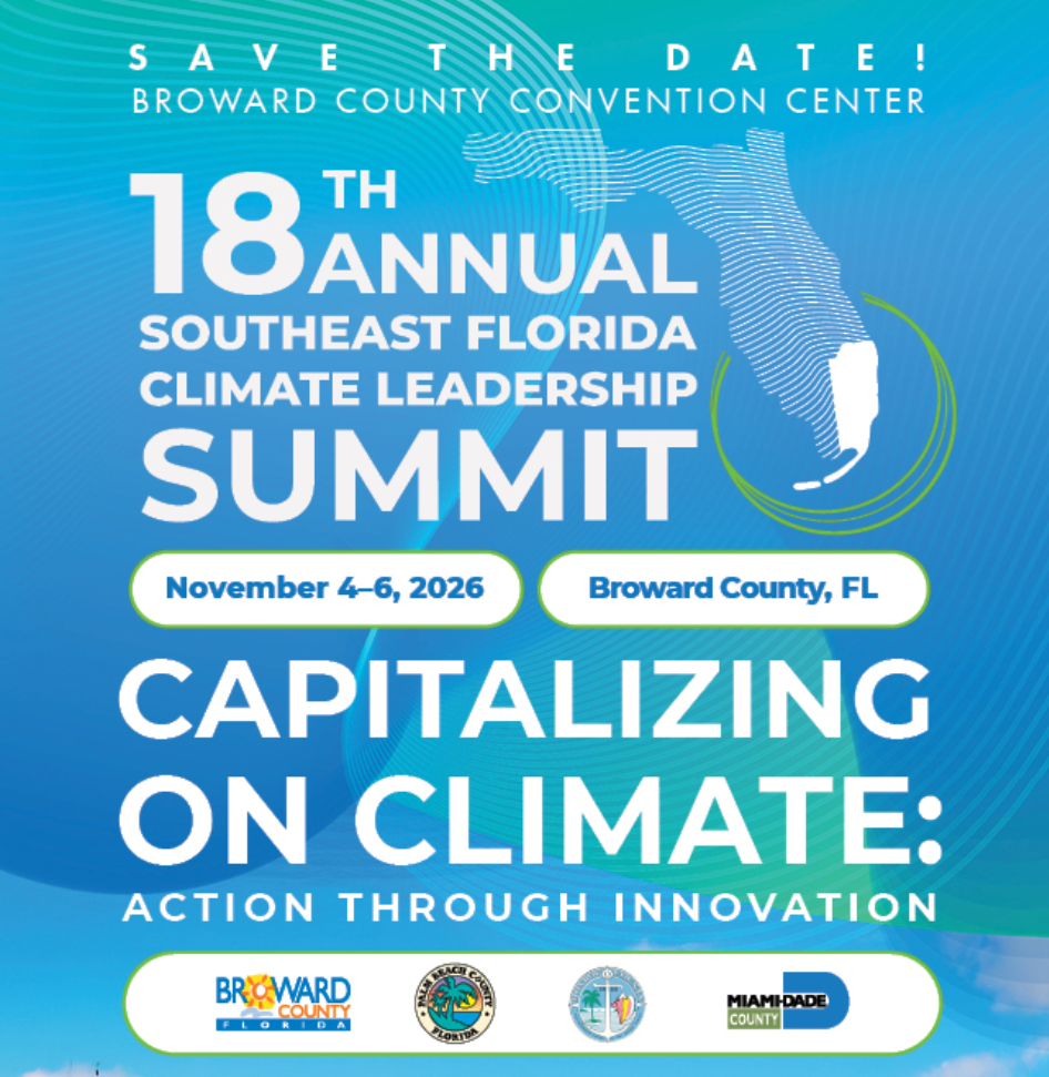 On behalf of the Southeast Florida Regional Climate Change Compact, Broward County is proud to be hosting the 18th Annual Southeast Florida Climate Leadership Summit on November 4-6, 2026, at the newly renovated Broward County Convention Center. The theme of this year's summit is "Capitalizing on Climate: Action through Innovation." Please save the date and look for additional details, including registration information, in the coming months.