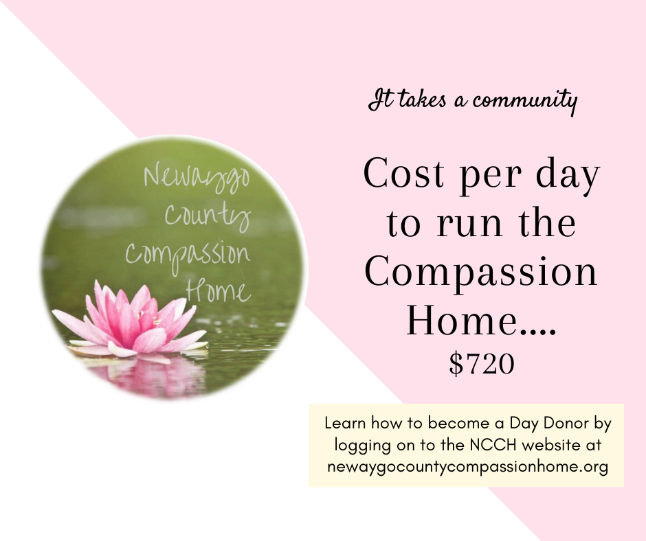 Visit our website at www.newaygocountycompassionhome.org or the attached link to view a “Day Donor” memory. Our goal is to engage 365 Day Donors each year. Will you help us achieve our goal? It takes a community…