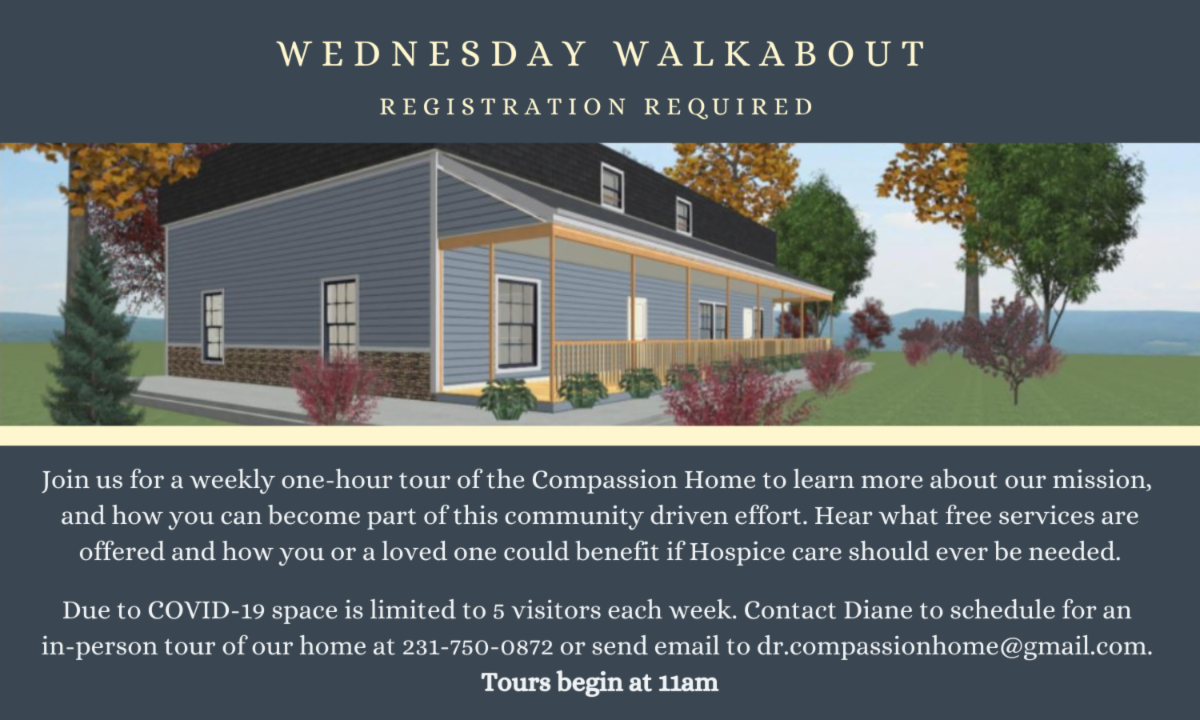Registration is necessary so we can plan accordingly. Contact Diane to schedule for an in-person tour of the Compassion home at 231-750-0872 or send email to dr.compassionhome@gmail.com.