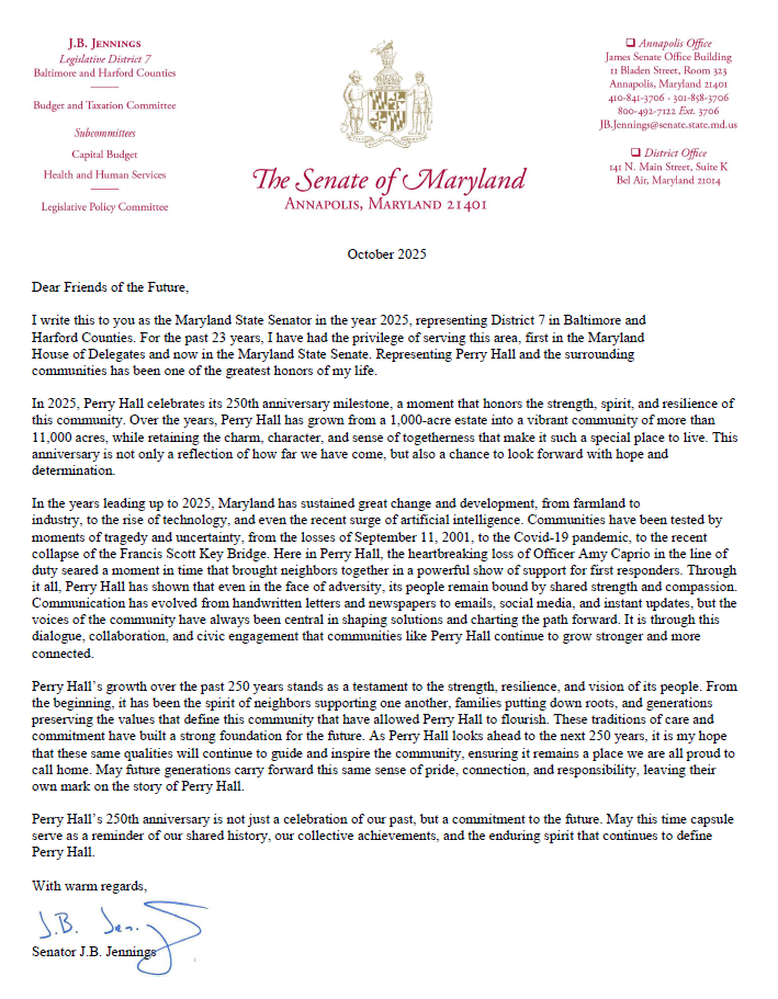 A special thank you to Vicki and Pat Keller and their team, for leading this meaningful project. Your dedication to celebrating 250 years of Perry Hall’s history ensures that future generations will remember the strong sense of community that makes this place so special.