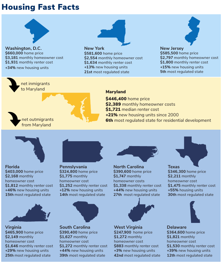 - Maryland is not developing at an appropriate growth rate for the demand of the community. South Carolina and Maryland have similar populations, at 5 million and 6 million respectively. In 2010, the states approved a similar amount of around 14,000 housing permits. In 2022, South Carolina approved 40,000 permits, while Maryland only approved 17,000 permits.