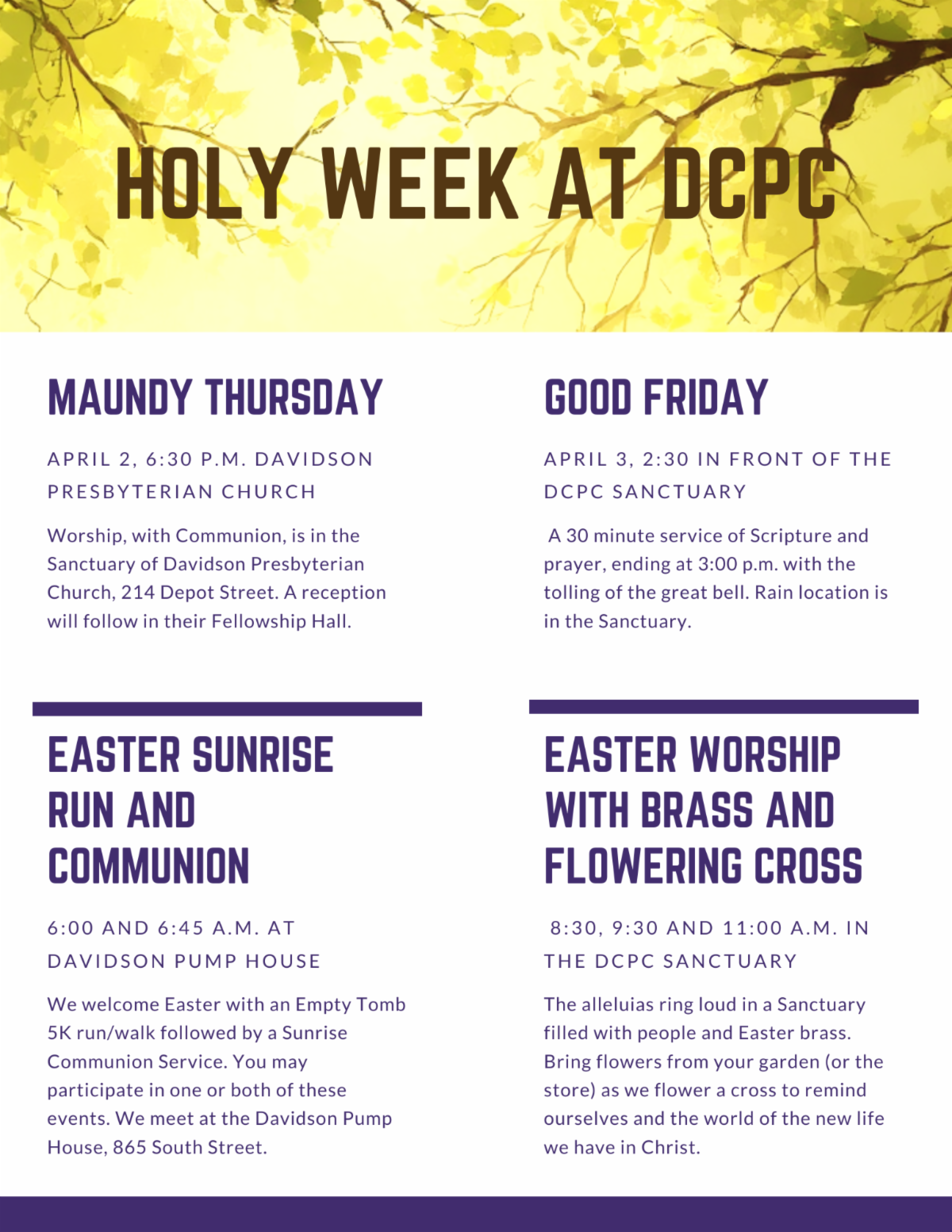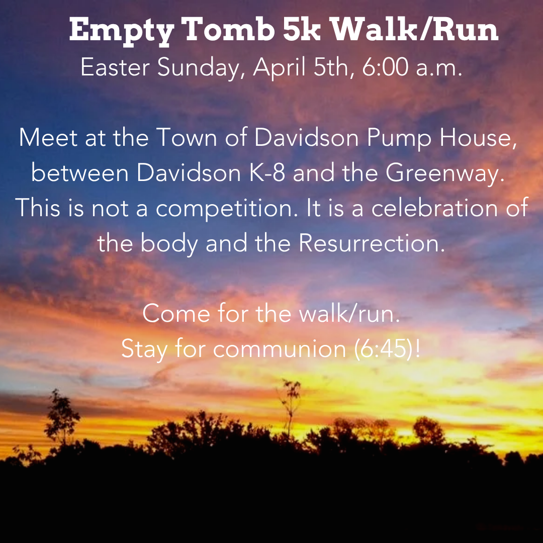 This week there is a 30 minute, informal sunrise service with communion at 6:45 a.m. at the Pump House in Davidson. You can park in the lot just to the south of Davidson elementary. We will worship there, rain or shine!