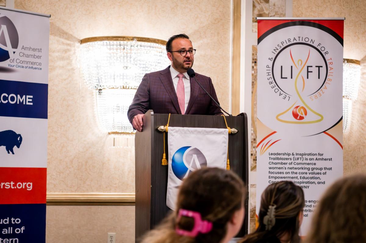 David and Allanna Beaton of Kelton Enterprises, our Business of the Year recipients, are the proud owners of 47 Tim Hortons, currently employing over 1,100 people across the Western New York community, making them the largest franchisee in the state. Their dedication and success serve as a shining example for aspiring entrepreneurs. They closed the evening by providing thanks to so many people that have helped them along the way such as Mike Dolan, a partner with Tronconi Segarra and Associates who have served as their accounting firm, and Brian Donovan the founder of EBC who has been providing payroll services for them since day one, but it was the sincere thanks to their all-female management team that were in attendance that received the most thunderous applause.