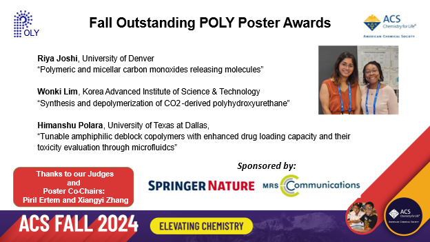 Award Purpose: to increase the importance and visibility of posters presented at ACS National Meetings in the POLY section. It is recognized that a great deal of work goes into preparing and presenting a high-quality poster. POLY wishes to acknowledge and reward such efforts.