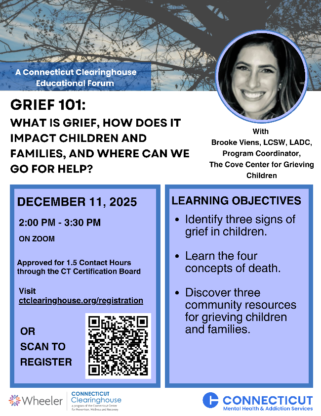 Connecticut Clearinghouse is a library and resource center for information on substance use and mental health disorders, prevention, health promotion and wellness, harm reduction, treatment and recovery, and other related topics. | | UPCOMING EVENTS AND TRAININGS | |