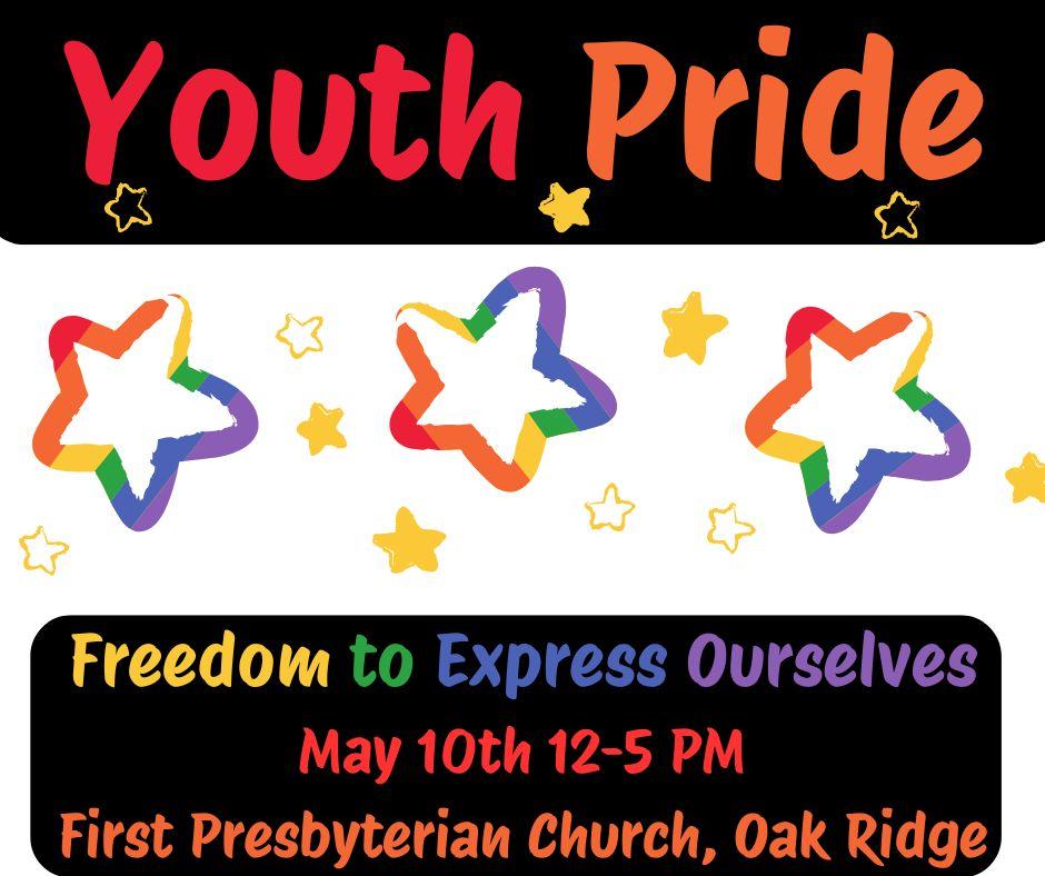 Join PFLAG for Youth Pride Saturday, May 10 from 12 to 5 p.m. at First Presbyterian Church in Oak Ridge! All are welcome. Oak Ridge has an active PFLAG group which meets monthly, rotating the venue among faith communities including the First Presbyterian, First United Methodist, and Oak Ridge Unitarian Universalist Churches, United Church Chapel on the Hill, and the Jewish Congregation of Oak Ridge. PFLAG (formerly known as an acronym for Parents, Families and Friends of Lesbians and Gays) is the United States' largest organization uniting families and allies with people who are lesbian, gay, bisexual, transgender, or queer (LGBTQ). Its mission is to provide opportunities for dialogue about sexual orientation, gender identities, and to create a society that is healthy and respectful of human diversity. For additional information, email PFLAG at pflagoakridgetn@gmail.com. | |