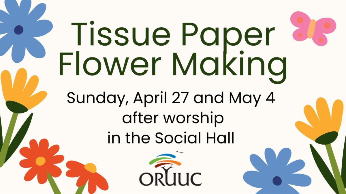 | | | | May 11 is the last day of Youth Faith Formation for this school year! Children and Youth will begin 2nd Hour with their groups and will join their families for Ice Cream around 12PM following a Closing Ritual. | This Sunday, help us spread beauty and show appreciation by making tissue paper flowers! All ages are welcome to try their hand at crafting in the Social Hall during Faith Formation hour. The flowers will decorate the Sanctuary for the month of May and remain up through Flower Communion Sunday, June 1. | |