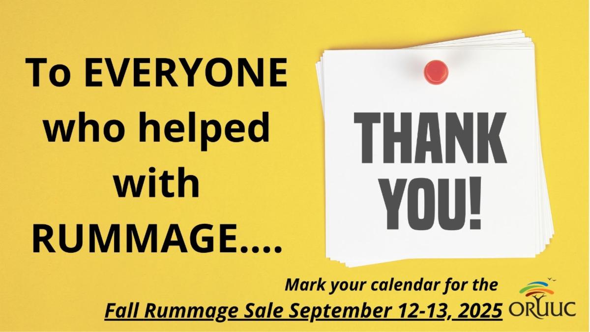 Hi everyone! I am happy to report that ORUUC has finished up another successful rummage sale! Thank you to everyone who donated, loaned tables & clothing racks, volunteered their time, and kept our volunteers fed with scrumptious meals throughout the week. I am particularly grateful for the other members of the Rummage Leaders Team: Christina Elliott, Jen Stark, Charles Davis, and Jim Nutaro. Charlie and Jim stepped up to join the leadership team for this sale, and their contributions allow us to share this ministry more sustainably and effectively. Thank you!