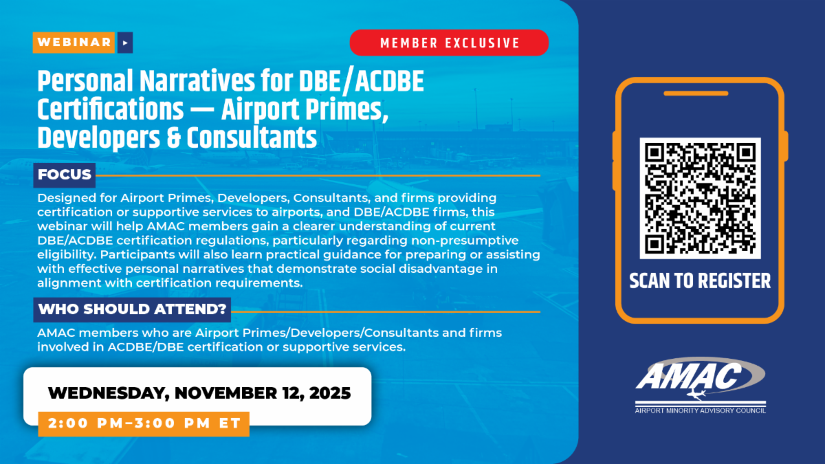 This webinar will help AMAC members gain a clearer understanding of current DBE/ACDBE certification regulations, particularly regarding non-presumptive eligibility. Participants will also learn practical guidance for preparing or assisting with effective personal narratives that demonstrate social disadvantage in alignment with certification requirements.