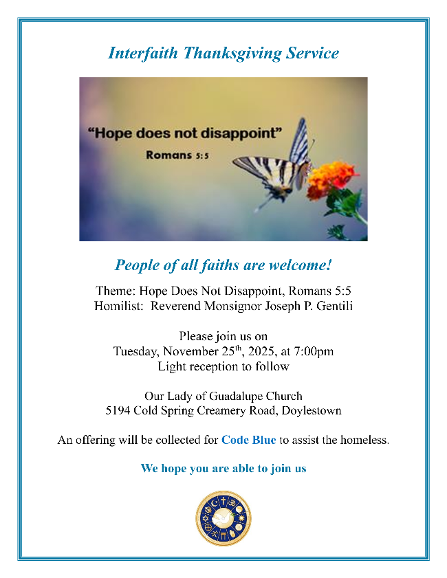 Thanksgiving Interfaith Service, Tuesday, Nov. 25, 7:00 pm @ Our Lady of Guadalupe