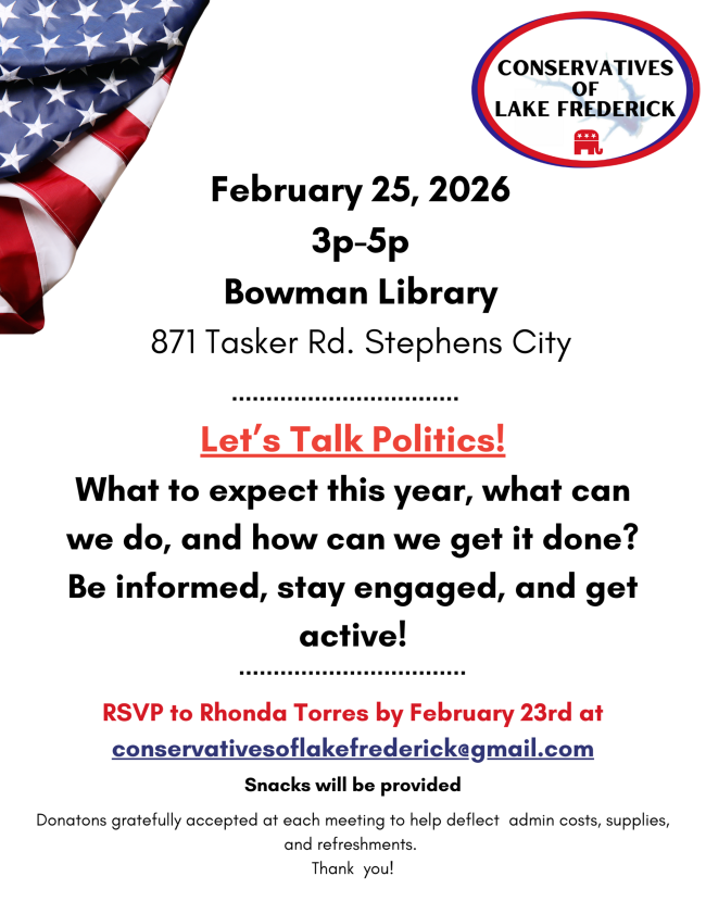 We have some exciting guests speakers. You will have the chance to meet and hear from Kim Farington, Senatorial Candidate aiming to unseat Senator Mark Warner (D). Emily Windle, Legislative Aided for Delegate Delores Oates, District 31, and Winchester City Council, Ward 2, will be giving us an update on the horrendous bills coming out of Richmond, and John Massoud, 6th District Chairman will be updating us on the status of our District.