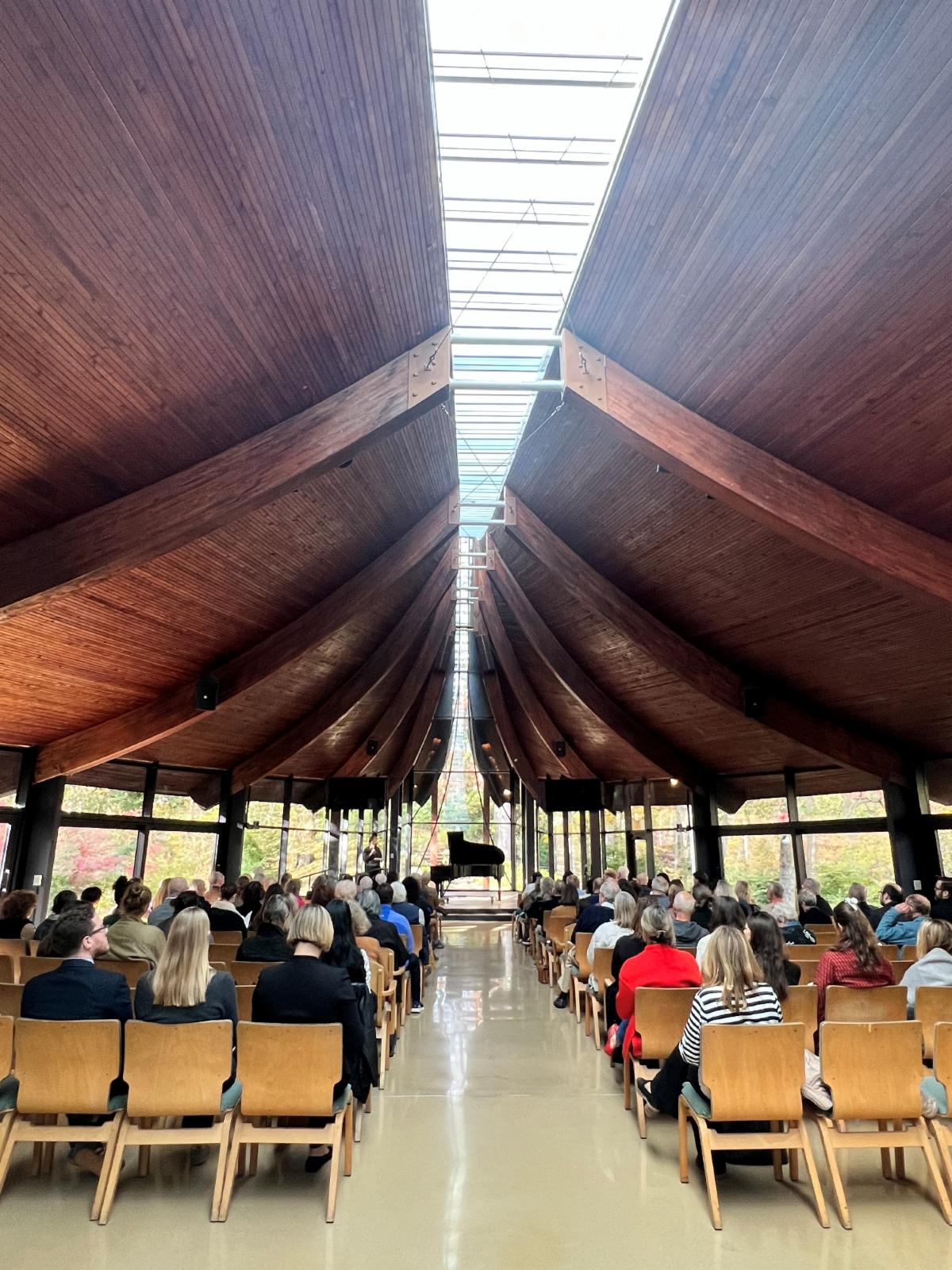 We are a justice-centered congregation, nestled in the woods in a stunning mid-century modern building with peaceful grounds that invite rest between sessions. Inside, our sanctuary is light-filled and comfortable, offering room to settle in, listen deeply, and breathe.