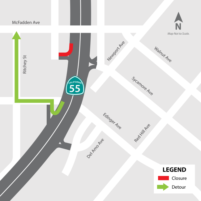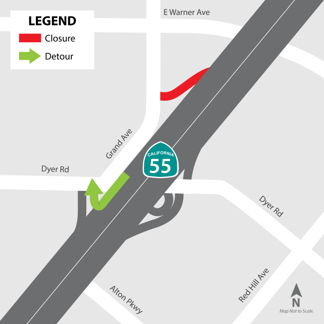 Crews are expected to perform drainage work at the southbound SR-55 Dyer Road straight off-ramp, which will require an extended closure of the ramp. The southbound SR-55 Dyer Road loop off-ramp will remain open.