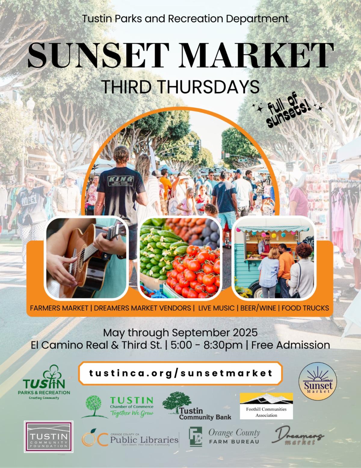Join the City of Tustin on Thursday, June 19 from 5 to 8:30 p.m. at their Sunset Market! This event is free to the public where you can enjoy the farmer's market, vendors, live music, and food trucks. For more information, visit tustinca.org/sunsetmarket.