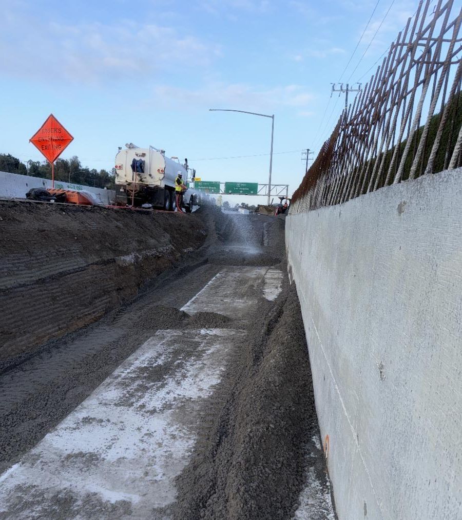 Crews finishing the installation of the structure backfill along the new sound wall further along the WB 91 on-ramp at Lakeview.