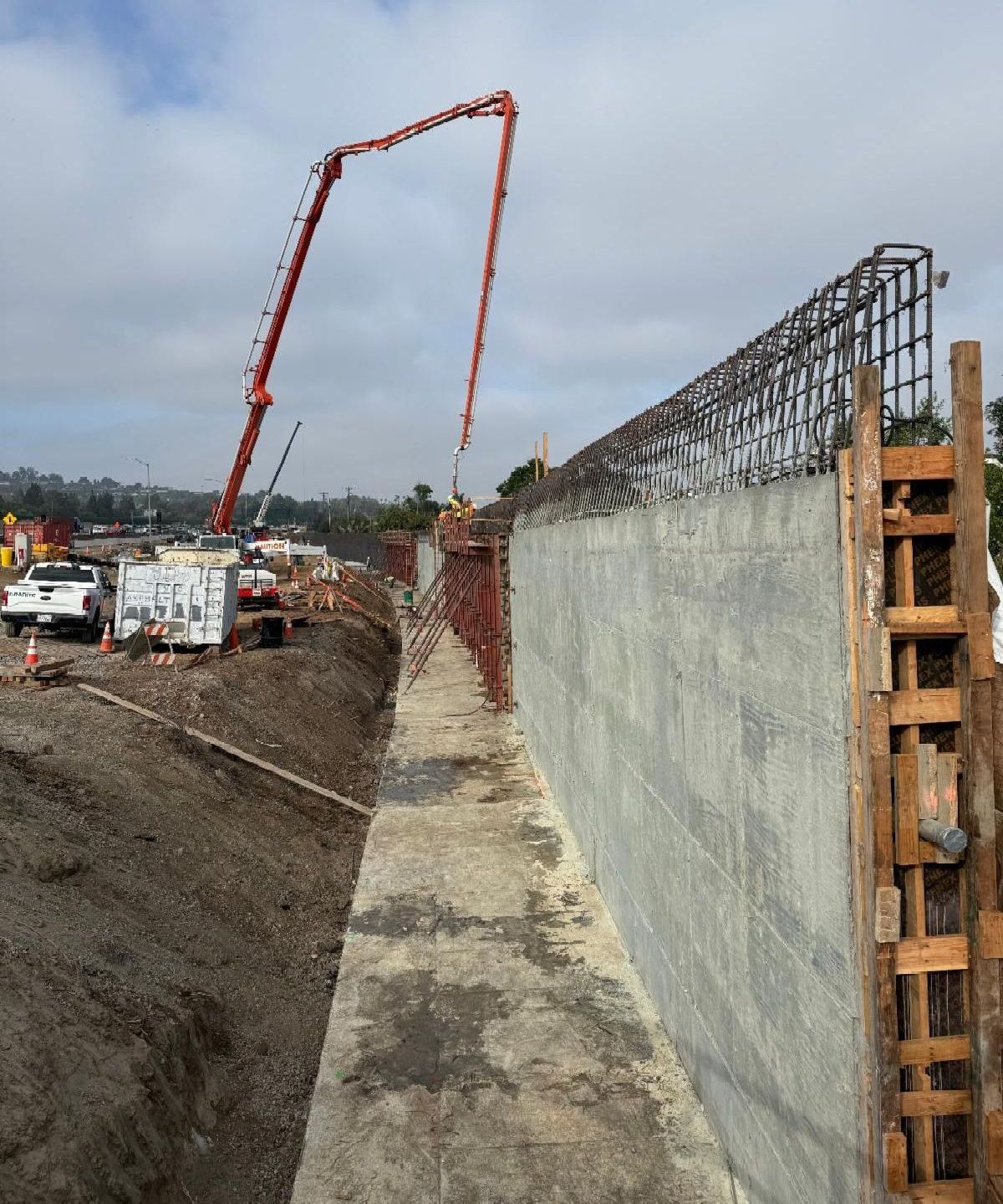 Crews pouring concrete to construct the stems, the main structural support, of the new sound wall.