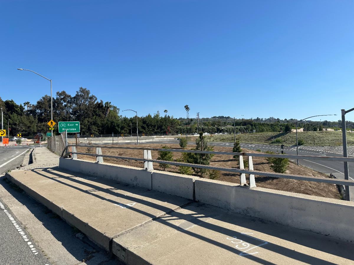 In preparation to construct the new Lakeview Avenue bridge, crews have begun what is known as a "settlement" period along the WB SR-91 off-ramp. This process helps compact the soil to ensure long-term stability for the new bridge. The large mound of dirt will remain in place for approximately one month while the earth settles.