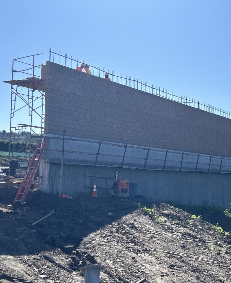 Crews placing blocks, continuing to build the sound wall along the WB SR-91 on-ramp at Lakeview Avenue.