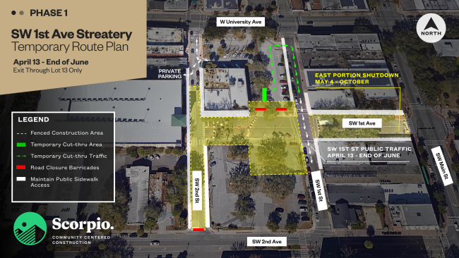 In March 2026, the Gainesville City Commission unanimously approved a $4.5 million construction agreement with D.E. Scorpio Corporation for The Streatery, funded by the Gainesville Community Reinvestment Area (GCRA) and the gas tax fund.