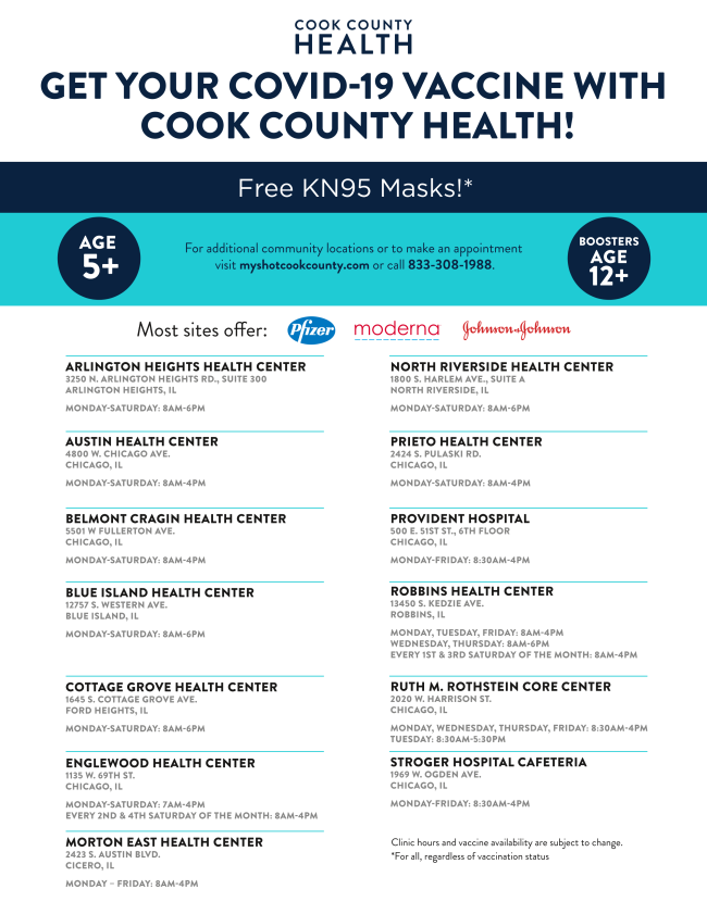 Cook County Health will continue to administer the COVID-19 vaccine at its community health centers, hospitals and through pop-up vaccination events. CCH’s community health centers are also distributing free high-quality KN95 masks for all, regardless of vaccination status.