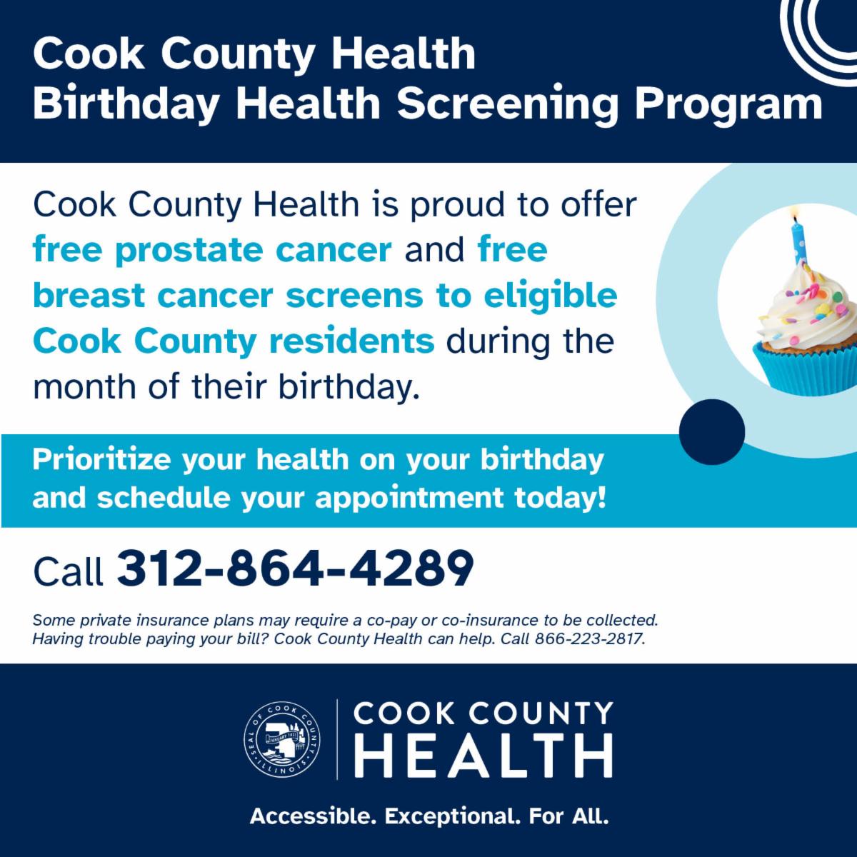 With support from Cook County Commissioner Bill Lowry, who also serves as Vice Chair of the Cook County Health Board of Directors, the health system offers a Birthday Health Screening Program. The program encourages Cook County residents who meet the clinical guidelines for breast or prostate cancer screening to schedule an appointment at CCH during their birthday month. The screenings are free of cost for the majority of patients. Give yourself the gift of health and schedule a screening today by calling 312-864-4289.