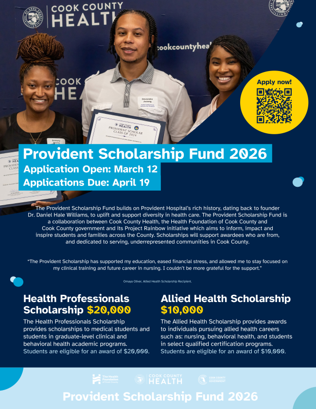 Earlier this month, Cook County Government, Cook County Health and the Health Foundation of Cook County announced the opening of the application process for the 2026 Provident Scholarship Fund.