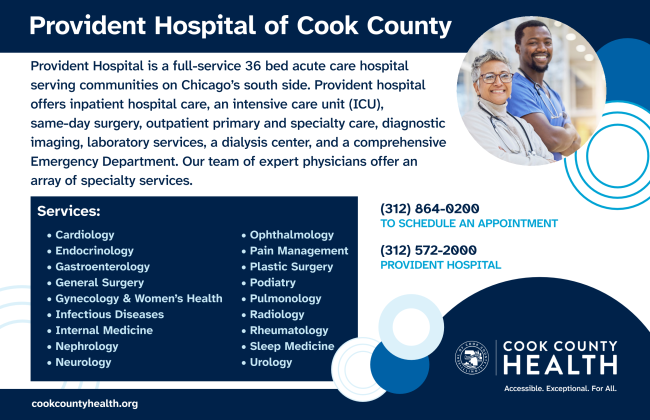 In 2021, Cook County Health opened a new dialysis center at Provident Hospital. The 6,600-square-foot standalone facility is located at 430 E. 50th Place in Chicago. It is a state-of-the-art facility to help patients undergoing treatment for chronic kidney disease.