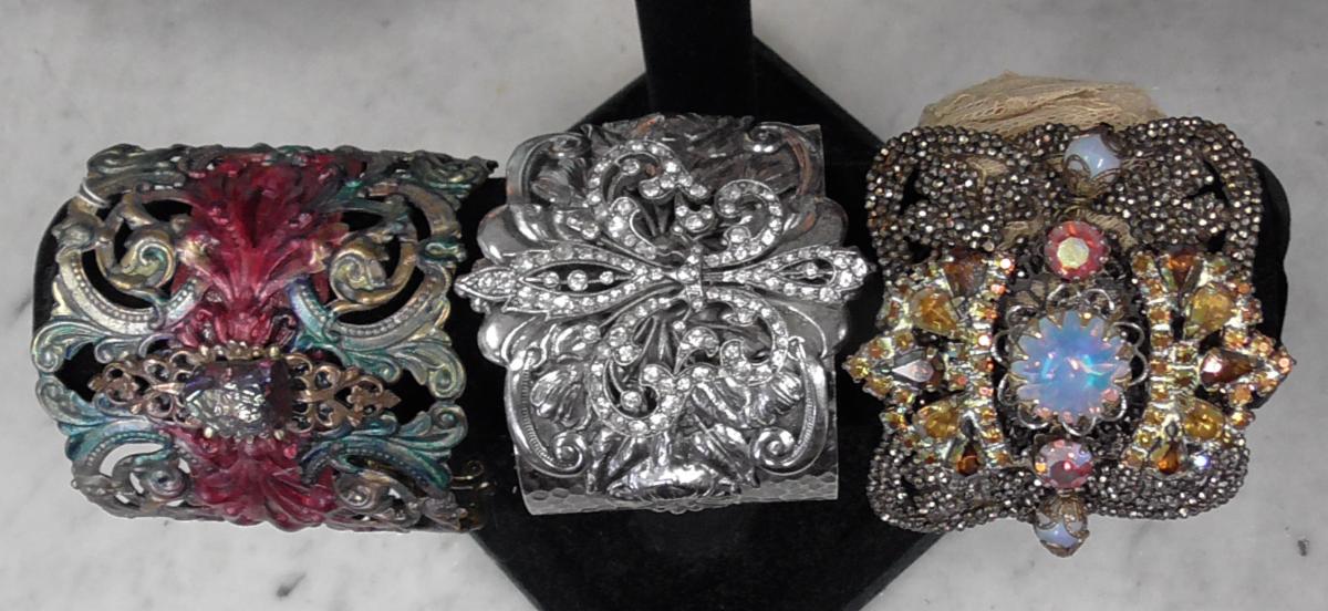 Fancy cuffs. The ones on the left and right are brand new. They're made of repurposed materials. Ooh-la-la, lush, and sparkly