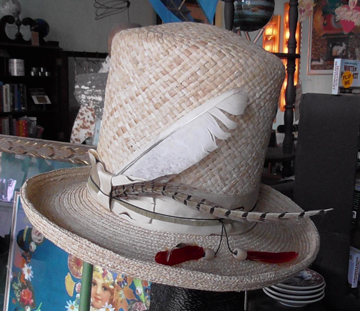 Tan straw hat. These new straw hats are wonderful. It's rare to see funky styles in straw. Check out this really high crown, as well as the dashing embellishment. Shield yourself from that intense sun in style.