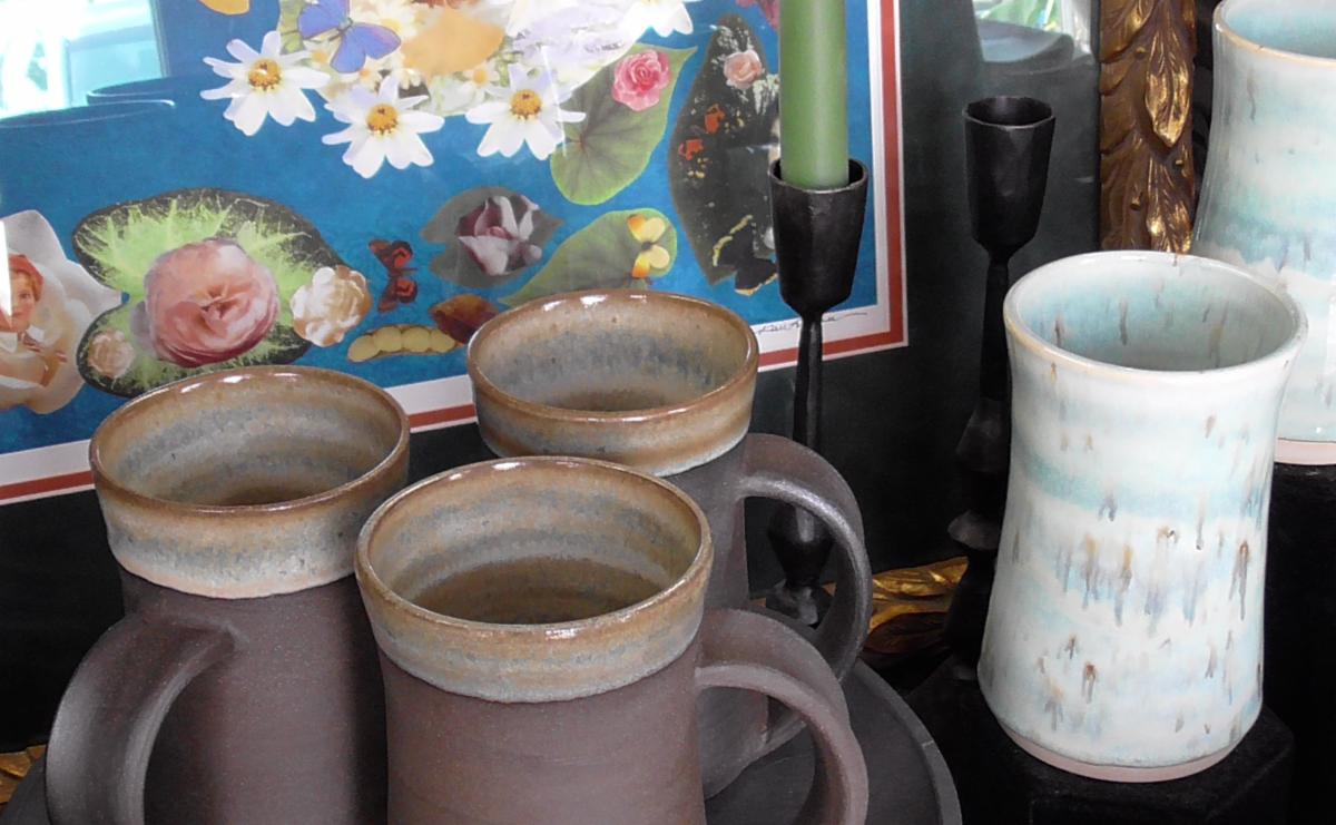 Mugs and cups. It's been a long time since we've had hand-turned drinkware. These are nice and tall, which may not show up in the pic. They are beautifully made and glazed by a local artisan