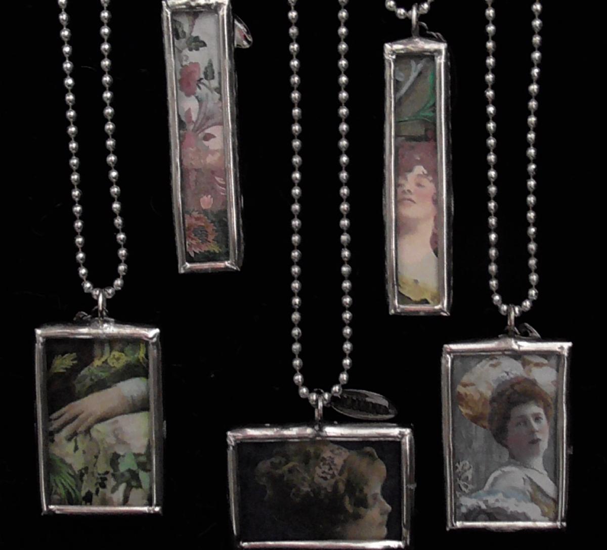 Luana's collage necklaces. Finally, a new ample batch! Here are just a few. The ones pictured feature fragments from