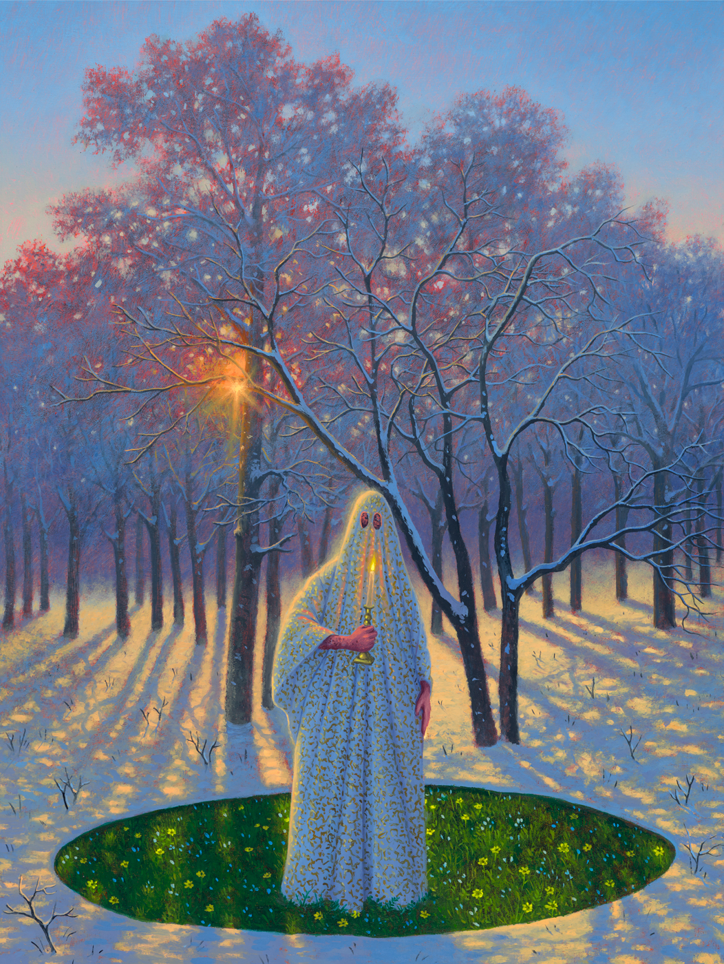 “Spirit Gardener with Vestige of Summer” (oil on panel, 18” (d) round)