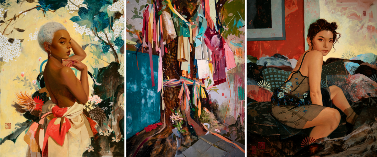 L-R: “Hydrangea Grove,” “Sathon Spirit Tree”, and “Self Portrait in April”
